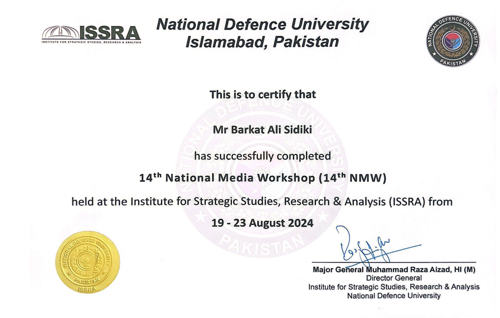 This certificate recognizes Mr. Barkat Ali Sidiki for successfully completing the 14th National Media Workshop (14th NMW), conducted by the Institute for Strategic Studies, Research & Analysis (ISSRA) at the National Defence University, Islamabad. The workshop was held from 19–23 August 2024 and was signed and endorsed by Major General Muhammad Raza Aizad, Director General of ISSRA.